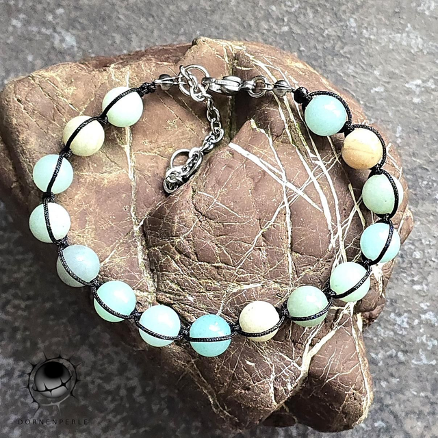 Die Perlen sind in einer speziellen Makramee-Umwickelung mit reißfestem, schwarzem Nylonfaden gefasst. Dies verleiht dem Armband einen modernen, leicht rustikalen Look und sorgt für hohe Stabilität.