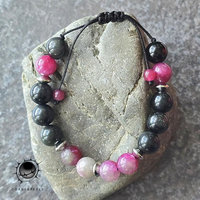 ​Erleben Sie die kraftvolle Synergie aus natürlicher Eleganz und energetischer Tiefe. Dieses handgefertigte Armband vereint die schützenden Eigenschaften des schwarzen Obsidians mit der lebensfrohen Ausstrahlung des Melonen-Turmalins. Akzentuiert durch hochwertige Edelstahl-Elemente ist dieses Schmuckstück ein zeitloser Begleiter für jeden Tag.