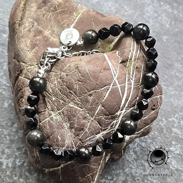Dieses exklusive Armband besticht durch seine tiefschwarze Optik und das spannende Spiel verschiedener Oberflächenstrukturen. Während die glatt polierten Obsidian-Perlen das Licht sanft reflektieren, sorgen die präzise facettierten schwarzen Achat-Perlen für ein elegantes Funkeln bei jeder Bewegung. Ein hochwertiger Karabinerverschluss aus Edelstahl mit Verlängerungskettchen garantiert nicht nur Sicherheit, sondern auch eine perfekte Passform.