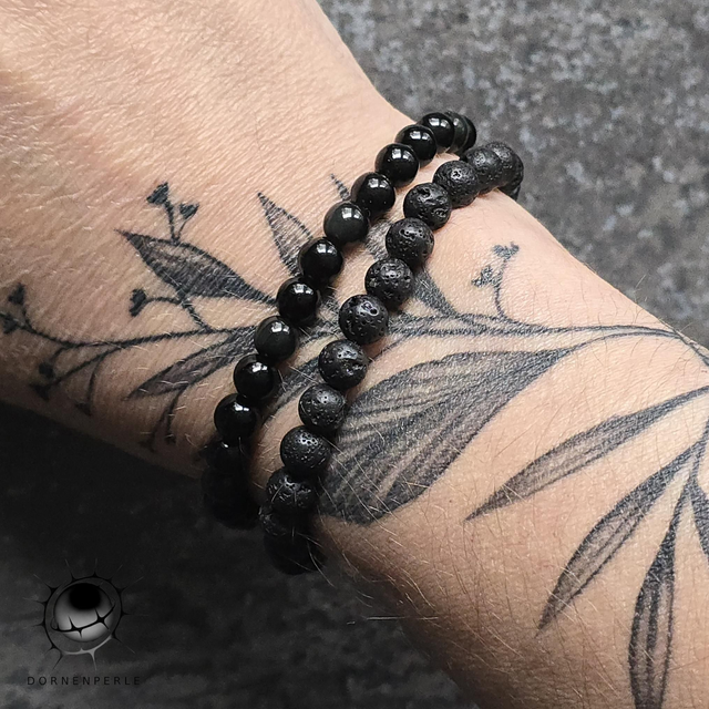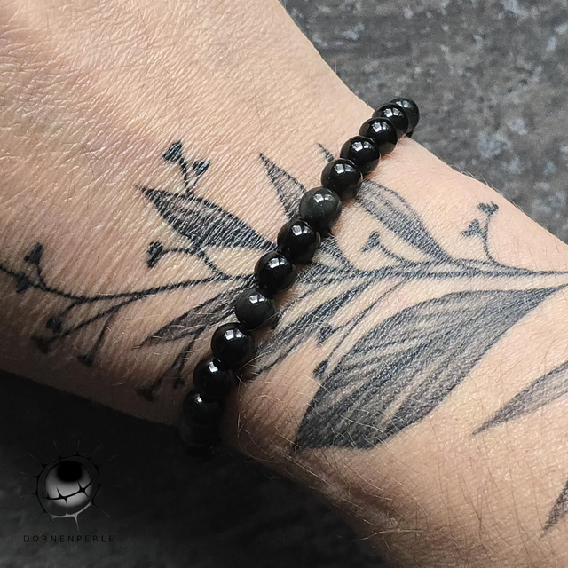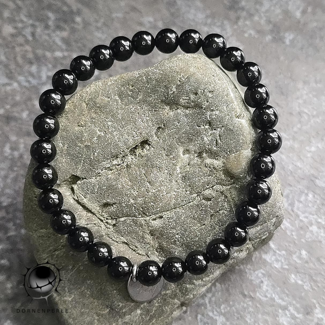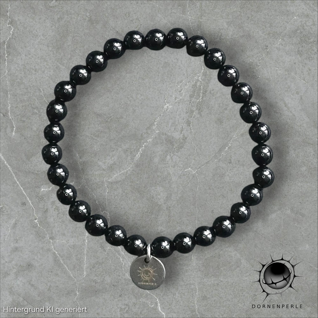 Dieses edle Armband aus tiefschwarzem Achat vereint schlichte Eleganz mit einer kraftvollen Ausstrahlung. Ein besonderes Highlight ist der filigrane Dornenperle-Logoanhänger, der dem Design eine exklusive Note verleiht.
