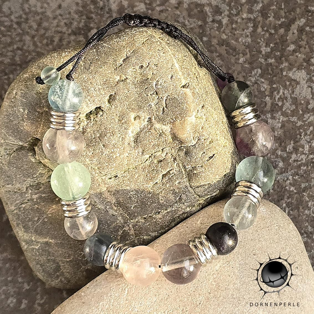 Die kühlen, glänzenden Edelstahl-Ringe zwischen den sanften Natursteinen symbolisieren Beständigkeit und verleihen dem Schmuckstück eine moderne, kraftvolle Note.