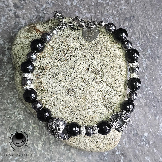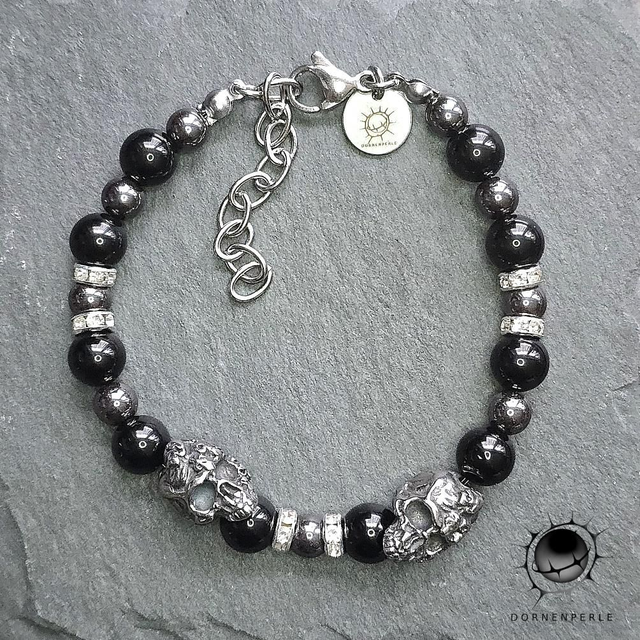 Zwei markante Edelstahl-Skulls dienen als Blickfang und symbolisieren unerschütterliche Stärke. Ergänzt wird das Design durch präzise geschliffene Kristall-Elemente, die das Licht einfangen und einen luxuriösen Akzent setzen. Ein Schmuckstück für Individualisten, die Wert auf Qualität und Symbolik legen.