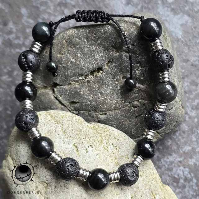Dieses handgefertigte Armband vereint die rohe Energie der Erde mit zeitloser Ästhetik. Die Kombination aus tiefschwarzem, strukturiertem Lavastein und spiegelglattem Obsidian schafft einen faszinierenden Kontrast, der durch hochwertige Edelstahl-Elemente modern akzentuiert wird.