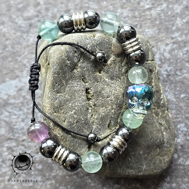 ​Dieses außergewöhnliche Armband vereint die sanfte Ausstrahlung des Natursteins mit einem markanten Statement-Design. Die transparenten Perlen aus grünem und violettem Fluorit harmonieren perfekt mit den glänzenden Hämatit-Farben und den robusten Edelstahl-Elementen. Das absolute Highlight ist der kunstvoll geschliffene Kristall-Skull, der je nach Lichteinfall in mystischen Blau- und Grüntönen schimmert.