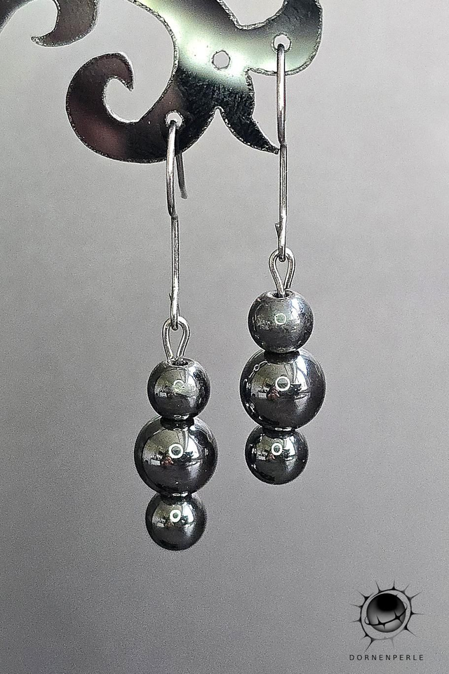 Erlebe die perfekte Harmonie mit unseren dreistufigen Hämatit-Ohrhängern. Die drei sanft abgestuften Perlen fließen elegant ineinander und erzeugen durch ihr metallisches Funkeln ein faszinierendes Lichtspiel bei jeder Bewegung.