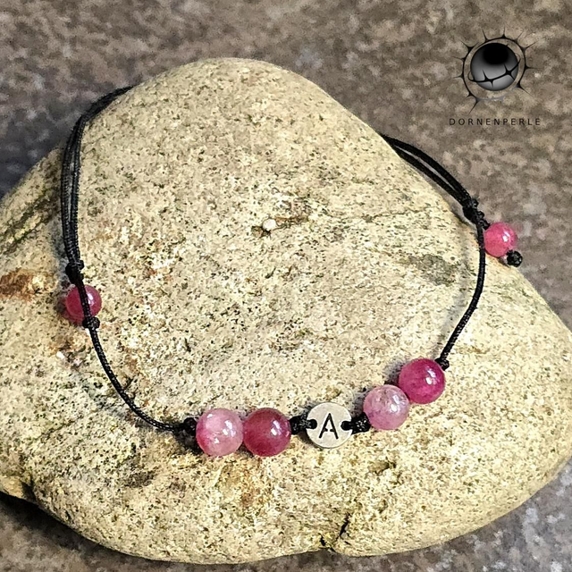 Dieses zarte Armband besticht durch die sanften Farbnuancen des Melonen-Turmalins. Die Perlen in harmonischen Rosa- und Pinktönen werden durch ein persönliches Highlight ergänzt: ein filigranes Edelstahl Plättchen mit dem Buchstaben "A". Ein Schmuckstück, das Individualität und feminine Eleganz perfekt vereint.