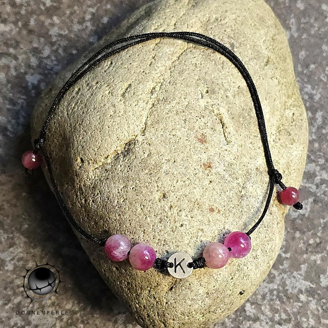 ​Erlebe die sanfte Kraft der Natur mit diesem handgefertigten Unikat. Dieses filigrane Makramee-Armband besticht durch seine leuchtenden Melonen-Turmalin Perlen, die in sanften Pink- und Beerentönen strahlen. Im Zentrum glänzt ein eleganter Edelstahl-Charm mit dem Initial „K“, der das Armband zu deinem ganz persönlichen Begleiter macht.