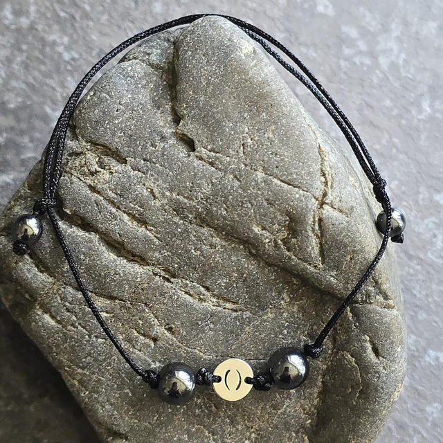 Dieses minimalistische Makramee-Armband besticht durch den markanten, metallischen Glanz des Hämatits. Die tiefgrauen, fast spiegelnden Perlen verleihen dem Schmuckstück eine zeitlose Eleganz und eine starke Präsenz. In Kombination mit dem schwarzen Nylonband und dem hochwertigen Edelstahl-Charm mit dem Initial "O" wird es zu einem persönlichen Kraftbegleiter.