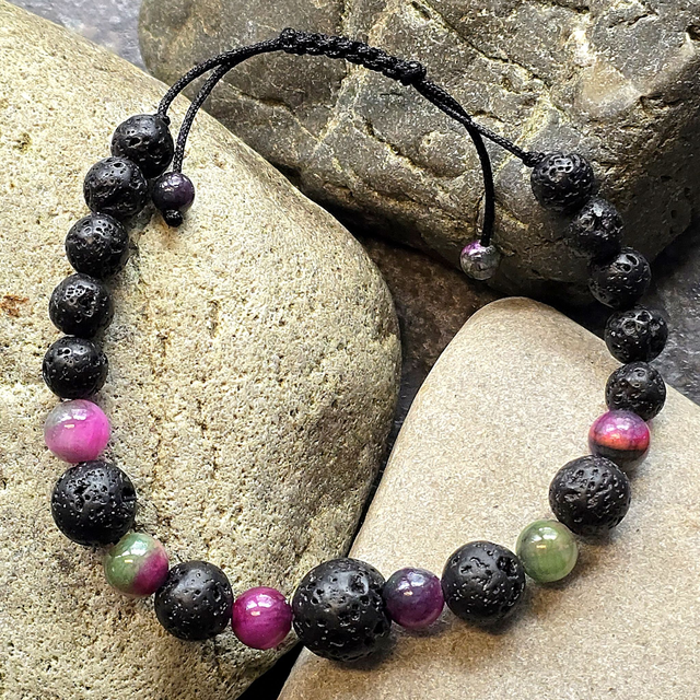 Dieses ausdrucksstarke Armband ist eine Symbiose aus Kraft und Sanftheit. Tiefschwarze, poröse Lavasteine treffen auf farbenfrohe, marmorierte Jadeit-Perlen in leuchtendem Pink und Grün. Das Design besticht durch den starken Kontrast zwischen der rauen, matten Oberfläche des Vulkangesteins und dem glatten, glänzenden Schimmer der Edelsteine.
