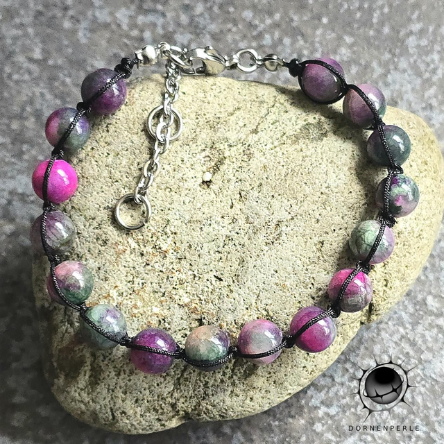 Dieses exklusive Armband ist ein Statement für Natürlichkeit und Lebensfreude. Jede der sorgfältig ausgewählten Jadeit-Perlen besticht durch ein individuelles Muster aus leuchtendem Pink, tiefem Violett und sanften Grüntönen. Die Perlen sind kunstvoll in ein Nylonband eingearbeitet, was dem Schmuckstück eine moderne, fast schon ethnische Note verleiht.