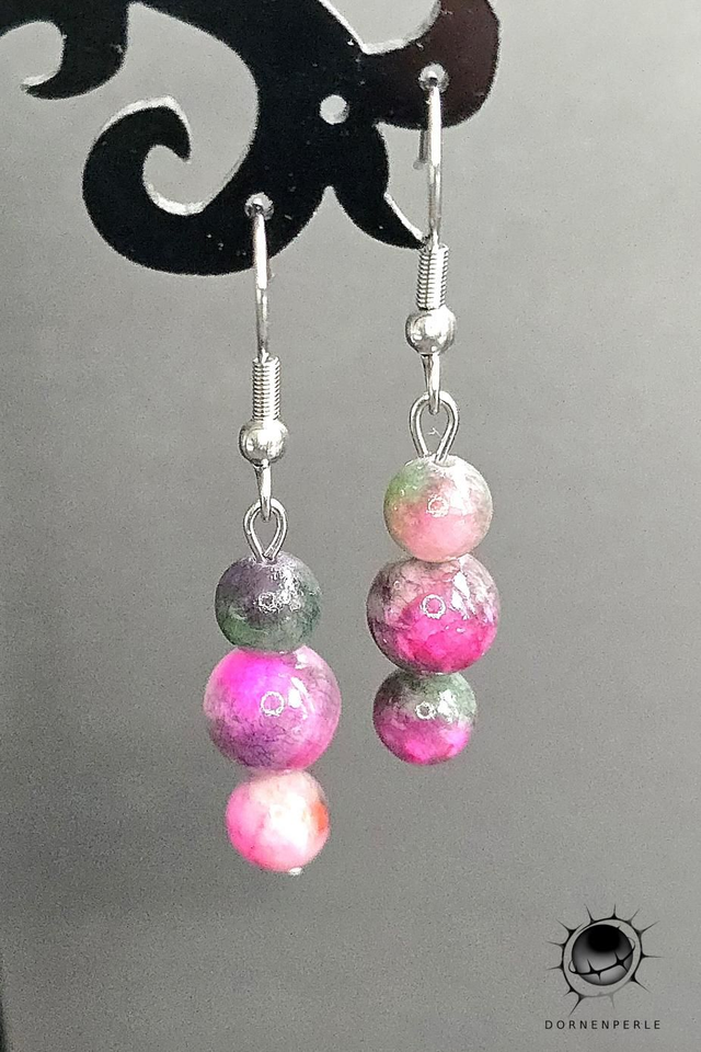 Bringen Sie Farbe und positive Energie in Ihr Leben mit diesen lebendigen Jadeit-Ohrhängern. In dieser Ausführung präsentieren sich jeweils drei sorgfältig ausgewählte Perlen in einer dynamischen Anordnung. Die markanten Farbverläufe in leuchtendem Pink, kombiniert mit sanften Grüntönen und erdigen Akzenten, machen jedes Schmuckstück zu einem ausdrucksstarken Unikat.