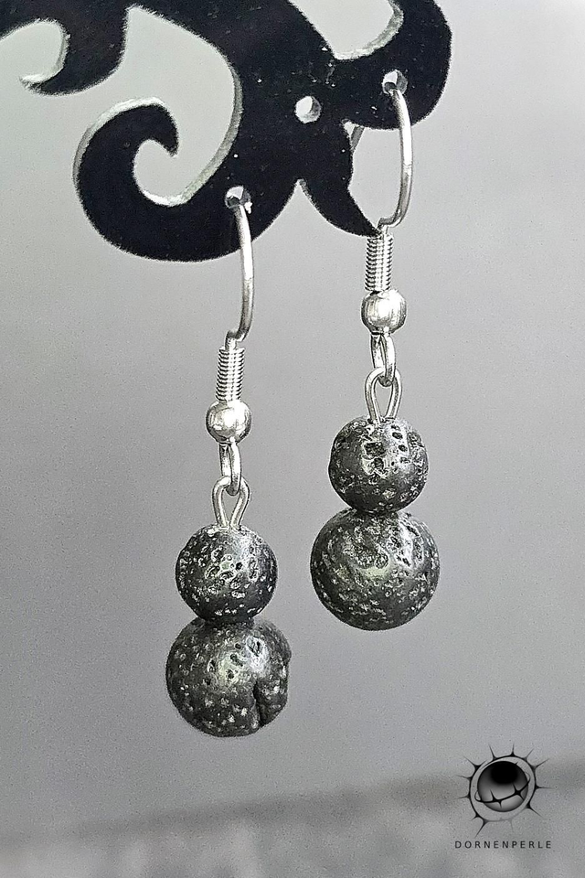 ​Setze ein Statement mit der rohen Schönheit der Natur. Diese handgefertigten Ohrhänger vereinen zeitloses Design mit der kraftvollen Energie vulkanischen Ursprungs. Die charakteristische, offenporige Struktur der dunklen Lavaperlen verleiht jedem Stück eine einzigartige Textur und einen Hauch von Mystik.