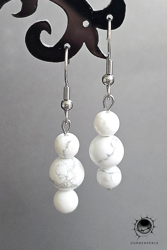Bringe Ruhe in deinen Alltag mit den Ohrringen „Lichtstrom“. Drei harmonisch abgestufte Perlen aus weißem Türkis (Howlith) bilden eine fließende Linie, die bei jeder Bewegung sanft mitschwingt. Die charakteristischen grauen Adern im Stein machen jedes Paar zu einem unverwechselbaren Naturprodukt.