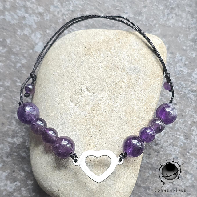 Dieses stilvolle Armband vereint die tiefe, beruhigende Eleganz des Amethysts mit einem zeitlosen Symbol der Liebe. Das zentrale, offen gestaltete Herz-Element aus Edelstahl ist eingebettet in hochwertige Edelsteinperlen und wird durch ein kontrastreiches, schwarzes Textilband modern in Szene gesetzt.