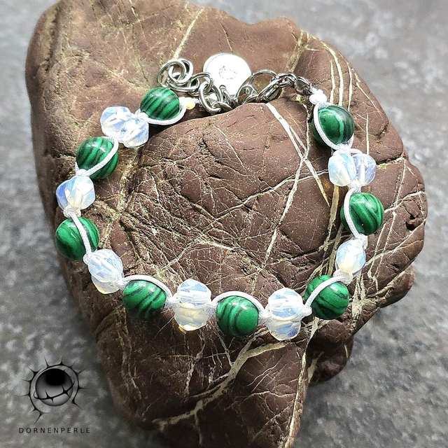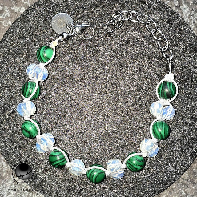 Dieses exquisite, handgearbeitete Armband besticht durch den starken Kontrast zwischen dem tiefgrünen, gebänderten Malachit und dem geheimnisvoll funkelnden weißen Opal. Die facettierten Opale fangen das Licht bei jeder Bewegung ein und verleihen dem Schmuckstück eine edle, lebendige Brillanz.