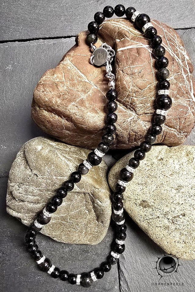 Die Kette besteht aus sorgsam gereihten Obsidian-Perlen, die für ihre erdende Wirkung bekannt sind. Er schenkt seinem Träger Schutz und neue Lebenskraft.