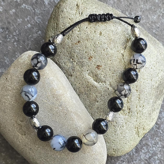 Entdecke die geheimnisvolle Ästhetik des Armbands „Nebelschleier“. Dieses handgefertigte Unikat kombiniert die zeitlose Eleganz von schwarzem Achat mit der einzigartigen, rissigen Textur von schwarzem Crack Achat. Filigrane Edelstahl-Elemente setzen glänzende Lichtpunkte und verleihen dem Design eine moderne, strukturierte Note.