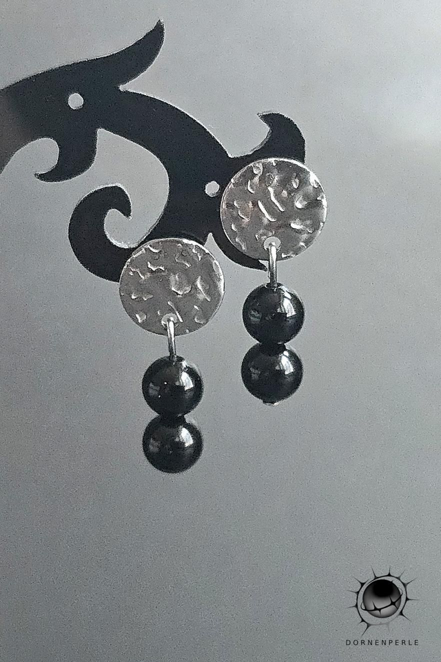 Diese handgefertigten Ohrhänger kombinieren das tiefe, glänzende Schwarz des Achats mit einer künstlerisch gehämmerten Edelstahl-Front. Ein ausdrucksstarkes Schmuckstück, das durch seinen starken Kontrast und seine puristische Eleganz besticht.