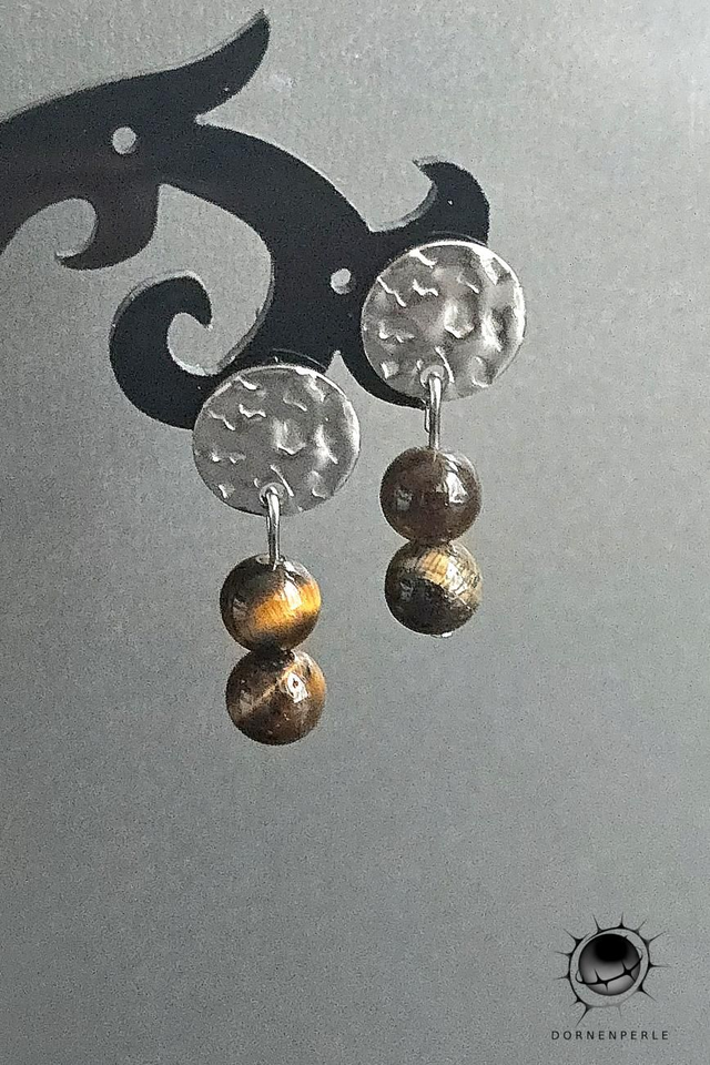 Diese handgefertigten Ohrhänger kombinieren das warme, goldbraune Leuchten des gelben Tigerauges mit einer künstlerisch gehämmerten Edelstahl-Front. Ein ausdrucksstarkes Accessoire, das natürliche Eleganz mit einem modernen Vintage-Touch verbindet.