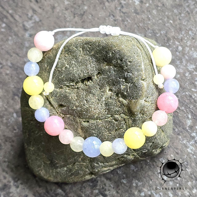 Dieses handgefertigte Unikat von Dornenperle stellt die natürliche Schönheit der Edelsteine in den Vordergrund. In dieser Variante verzichten wir bewusst auf Edelstahl Zwischenelemente, um den sanften Übergang der Pastelltöne fließen zu lassen. Das Armband kombiniert Morganit in verschiedenen Nuancen – von zartem Rosé über sanftes Gelb bis hin zu einem kühlen Blau-Violett.