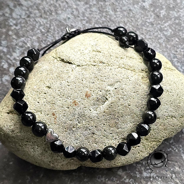 ​Dieses handgefertigte Schmuckstück besticht durch sein tiefschwarzes, edles Design und die abwechslungsreichen Texturen der Natursteine. Das Zusammenspiel aus glatt polierten Obsidian-Perlen und funkelndem, facettiertem schwarzem Achat verleiht dem Armband eine besondere Tiefe. Ein kleiner, silberfarbener Herz-Anhänger aus Edelstahl dient als liebevoller Akzent und macht das Design komplett.