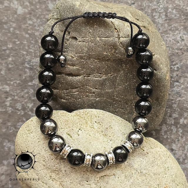 Dieses handgefertigte Armband ist ein Ausdruck von Stärke und zeitloser Eleganz. Die Kombination aus tiefschwarzem Achat und metallisch glänzendem Hämatit erzeugt einen maskulinen, edlen Look. Durch die strukturierten Edelstahl-Elemente und den handgeknüpften Makramee-Verschluss wird dieses Schmuckstück zu einem langlebigen und individuellen Begleiter für jeden Tag.