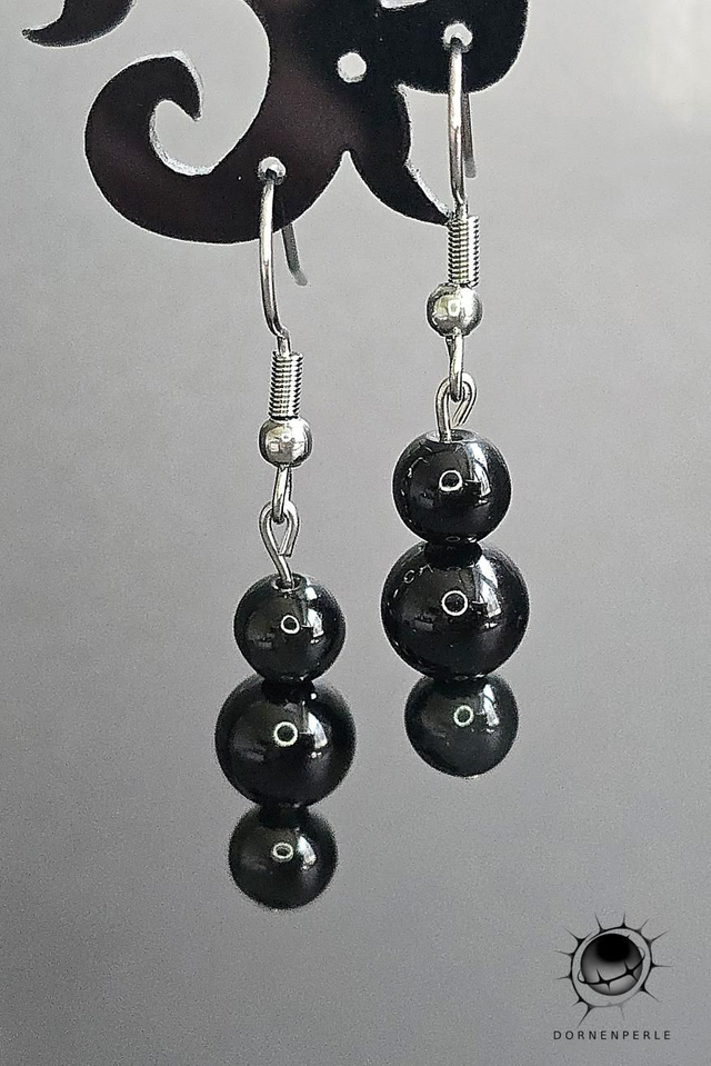 Diese stilvollen Ohrhänger vereinen klassisches Design mit der tiefen, geheimnisvollen Ausstrahlung des schwarzen Achats. Die drei untereinander angeordneten, glatt polierten Edelsteinperlen in unterschiedlichen Größen verleihen den Ohrringen eine harmonische Dynamik und machen sie zum perfekten Accessoire für jeden Anlass – ob Alltag oder Abendgarderobe.