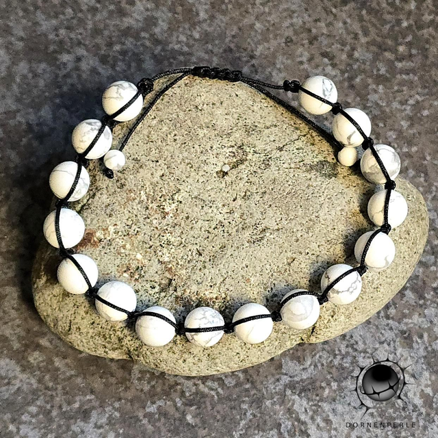 Finde deine innere Mitte mit dem Armband „Stiller Pol“. Die sanft marmorierten Perlen aus weißem Türkis (Howlith) wirken wie kleine, friedvolle Inseln in einem Meer aus dunklem, handgeknüpftem Schmuckgarn. Das minimalistische Design konzentriert sich ganz auf die natürliche Schönheit und die kühle Eleganz der Steine.